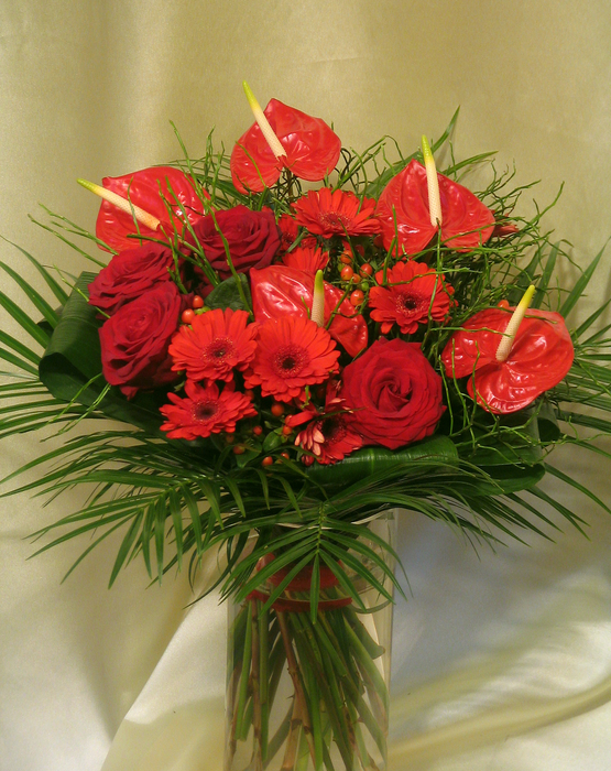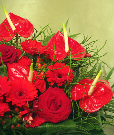 Szerelmes csokor egzotikus vörös anthuriumokkal, rózsákkal, minigeberával, hiperikummal. Igazi hatalmas ragyogó ajándék. Kapható két méretben!